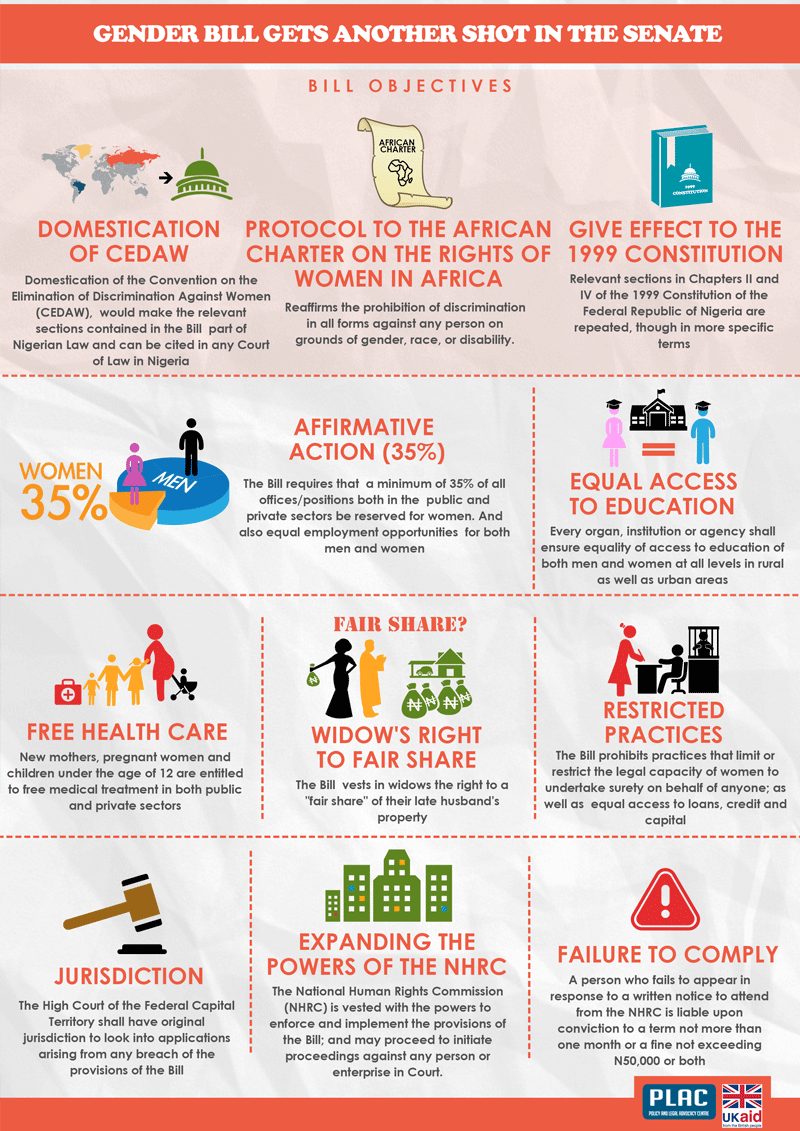 It is pertinent that Nigeria advances in its pursuit to uphold human rights at all standards and improve the country’s image globally. Domesticating international covenants that have already been ratified is one way of achieving this. The Gender and Equal Opportunities Bill, 2016 seeks to domesticate relevant parts of the Convention on the Elimination of all forms of Discrimination Against Women (CEDAW) and also prohibit certain practices on women that may be interpreted as unfair.